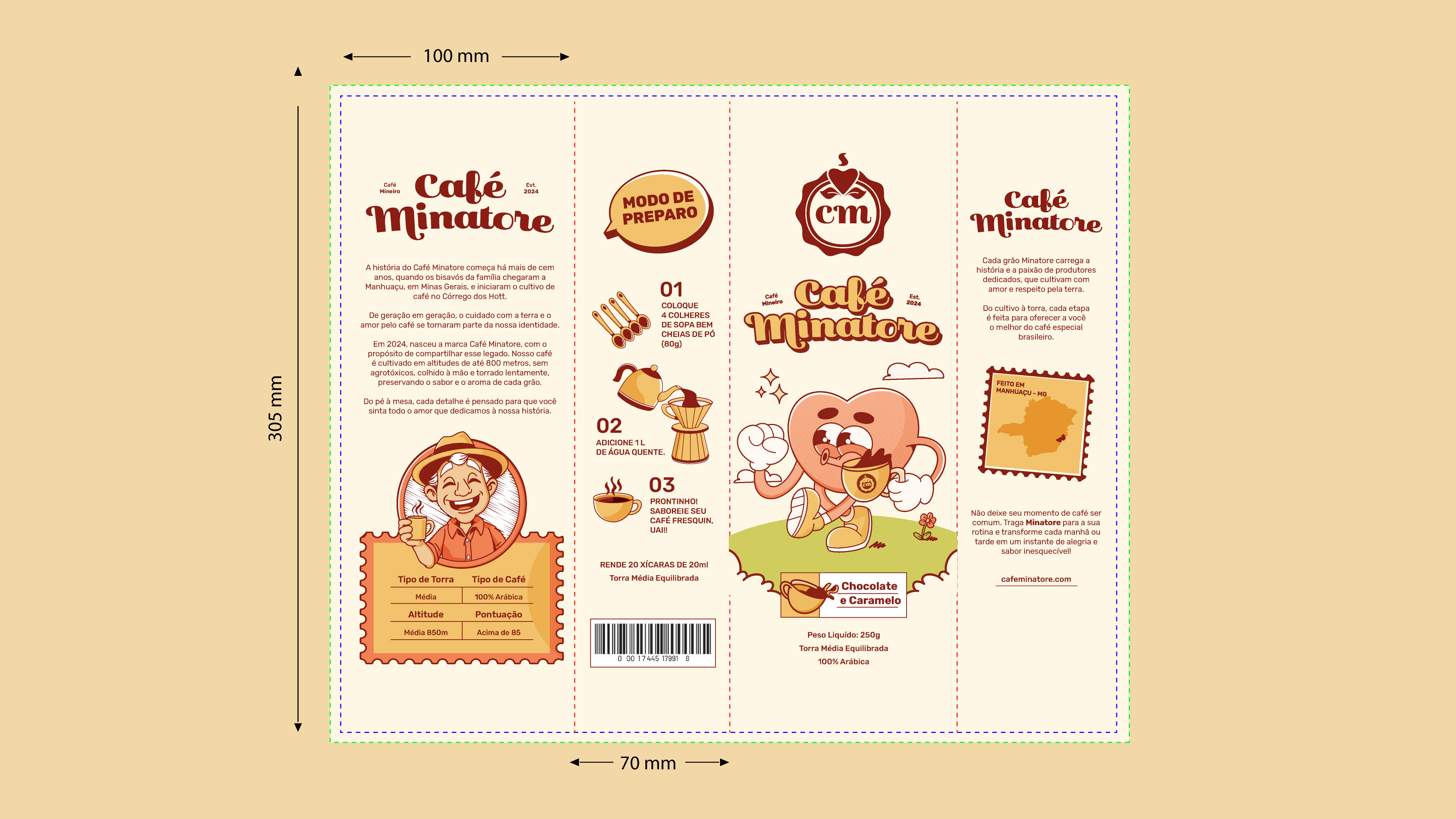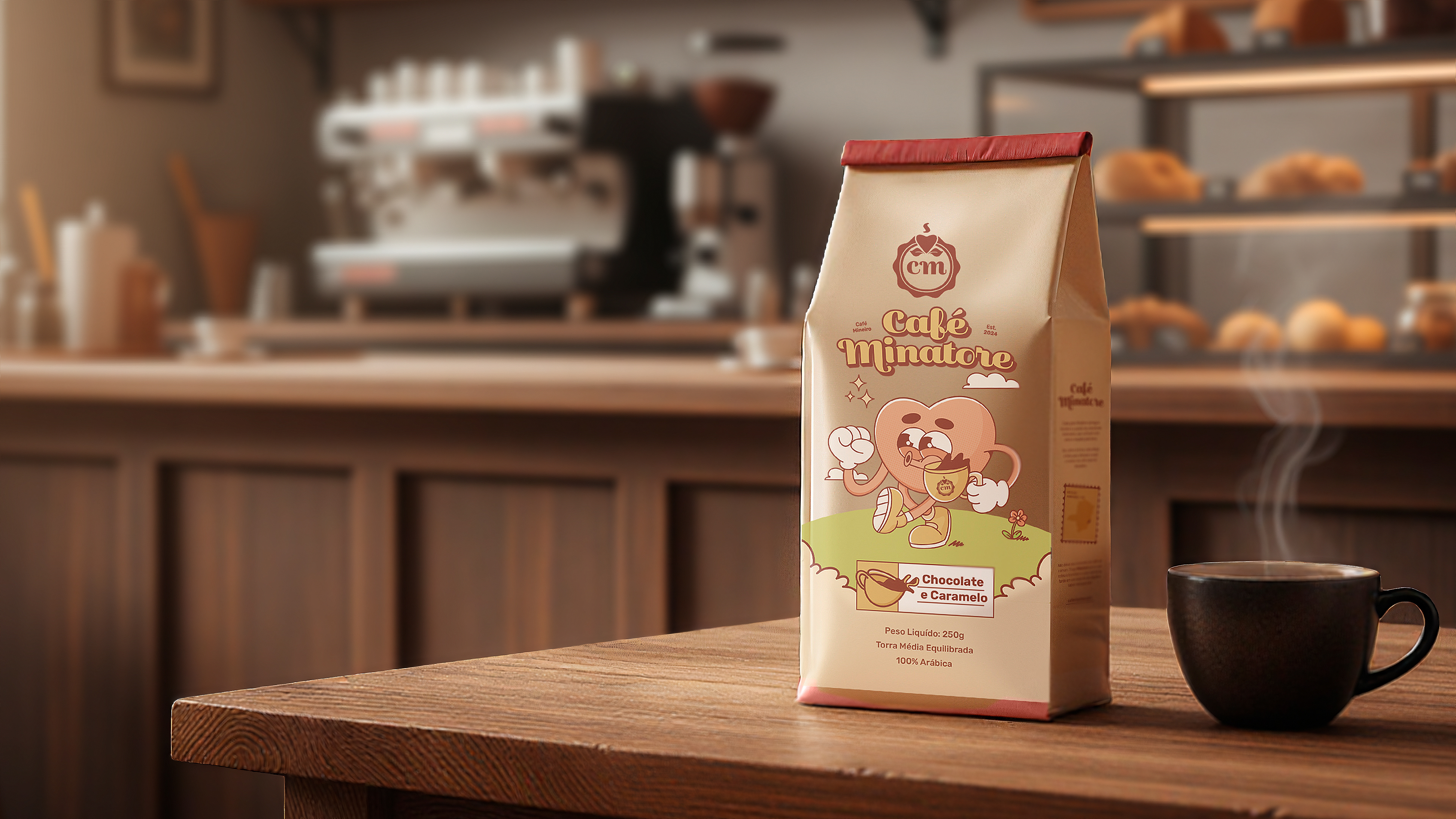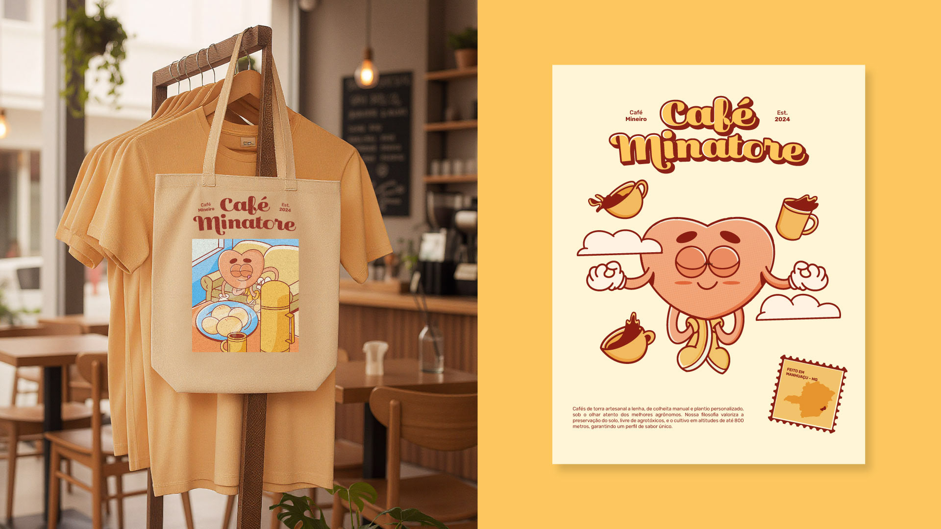 ( En ) Café Minatore was born from a century-old family tradition of cultivating specialty coffee in Manhuaçu, Brazil, bringing to each cup the essence of artisanal care, wood-fire roasting, and pesticide-free farming. Within this universe of flavor and affection, we had the privilege of creating Mineirinho, the brand’s official mascot: a heart deeply in love with Minas Gerais coffee, embodying the same passion shared by all Minatore customers.