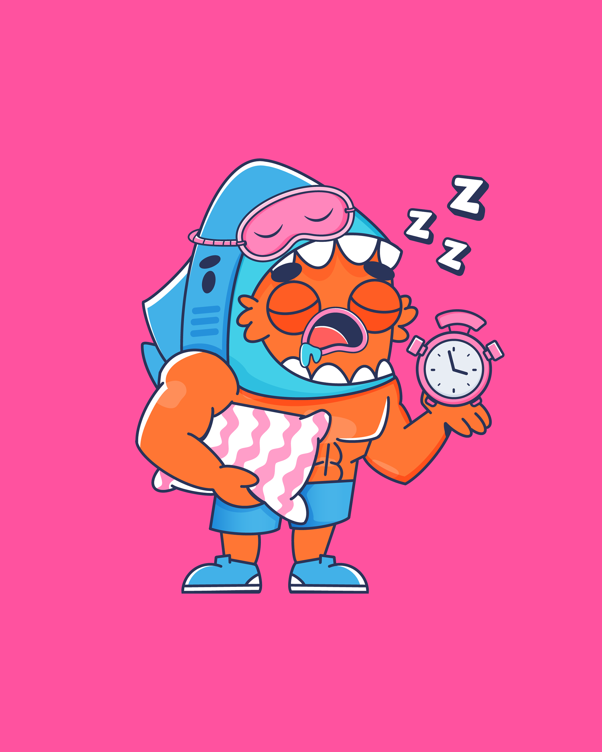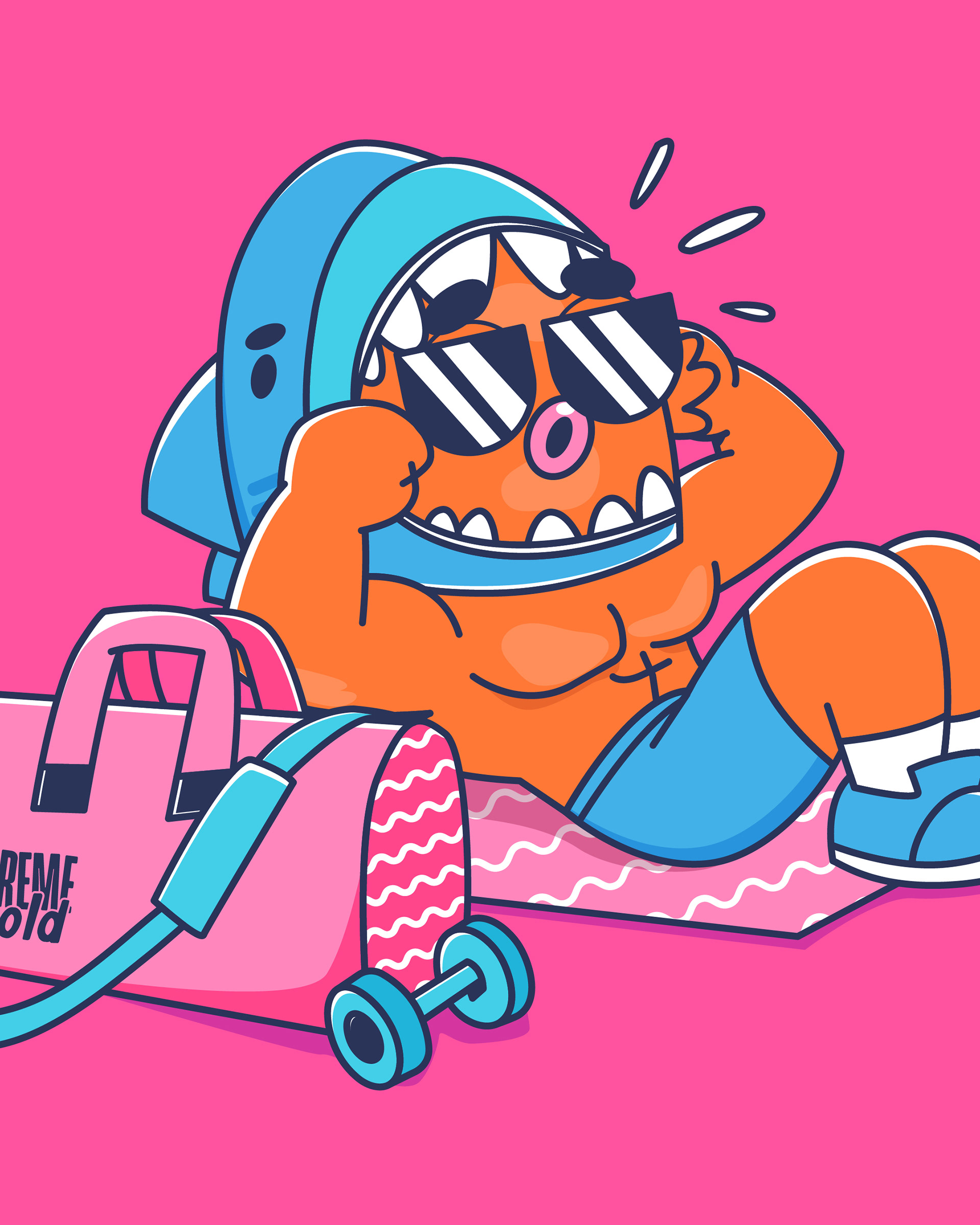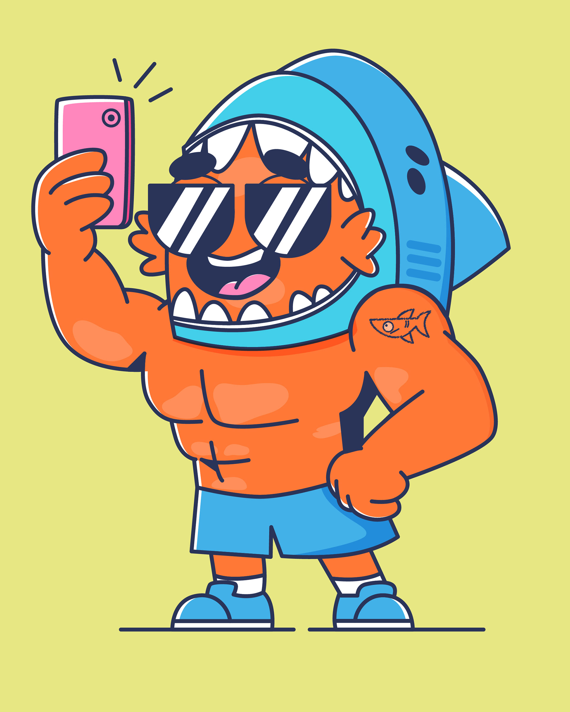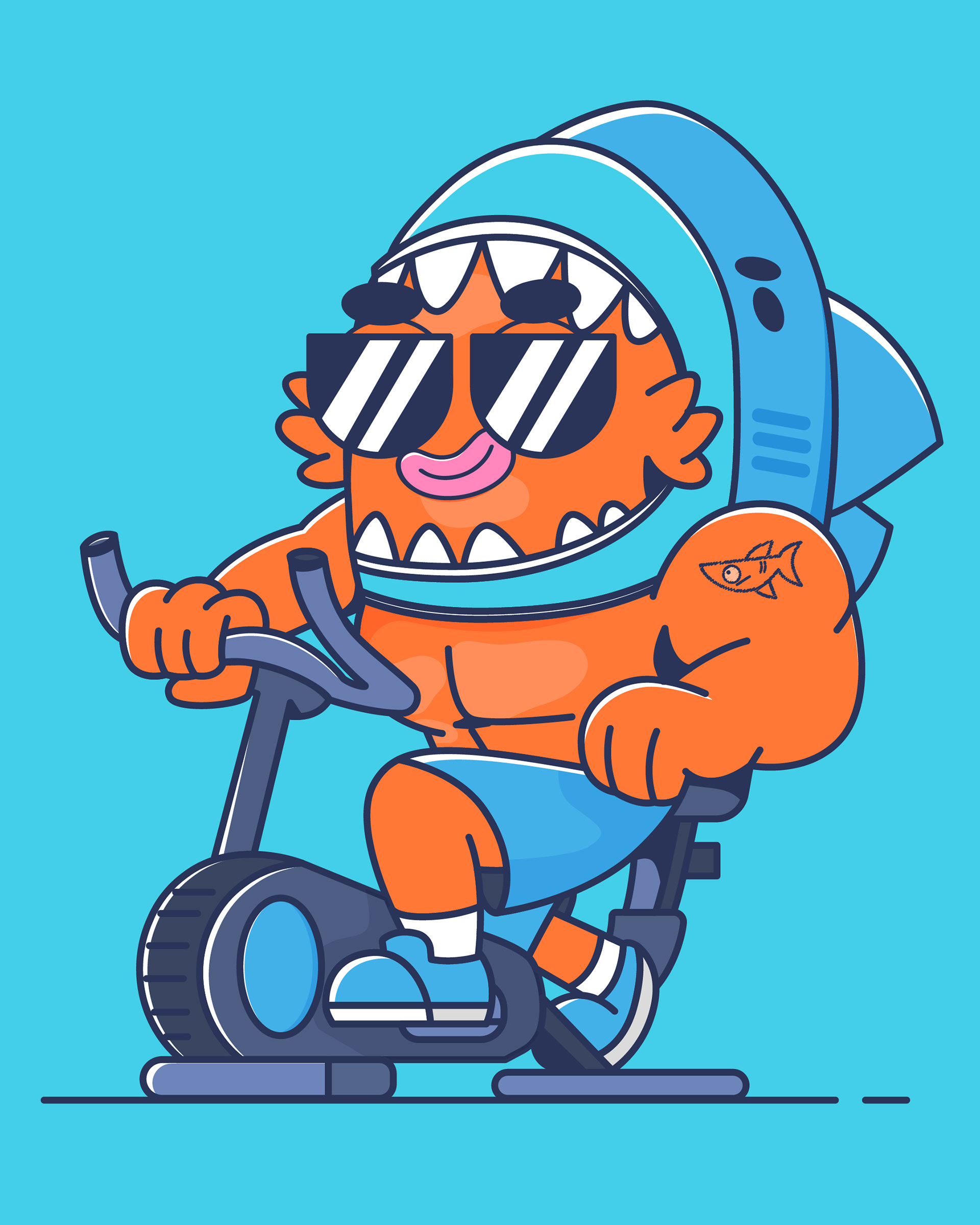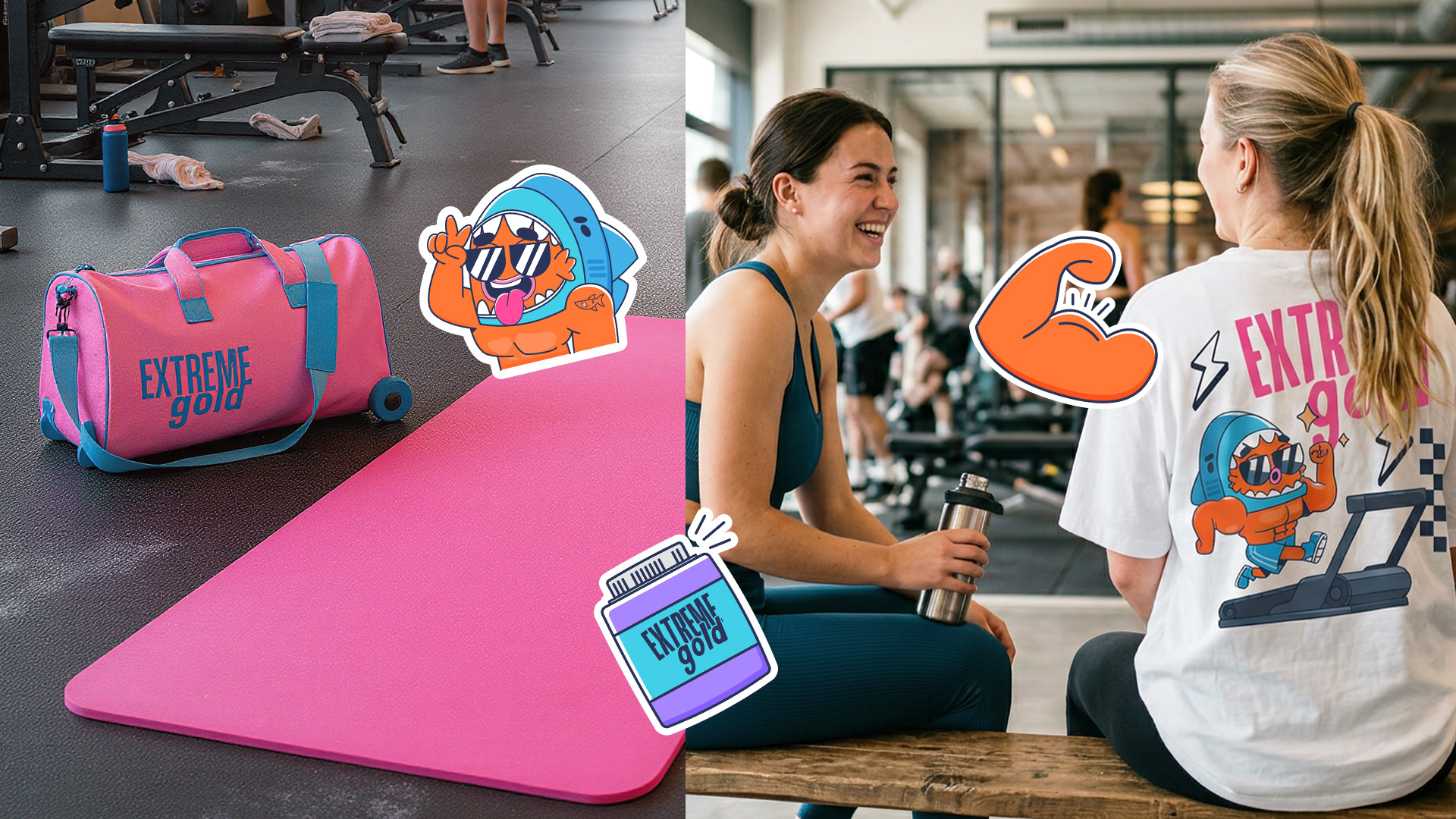 Criamos um mascote que traduz o espírito da Extreme Gold de uma forma leve, divertida e memorável: um pequeno peixe que se veste como tubarão. Um símbolo perfeito para representar quem está em constante evolução , ainda pequeno, mas com mentalidade de um campeão. Com personalidade forte, humor visual e expressões exageradas, o personagem retrata os altos e baixos da rotina fitness de forma autêntica: o treino pesado, a disciplina, as tentações da dieta e as pequenas vitórias do dia a dia.